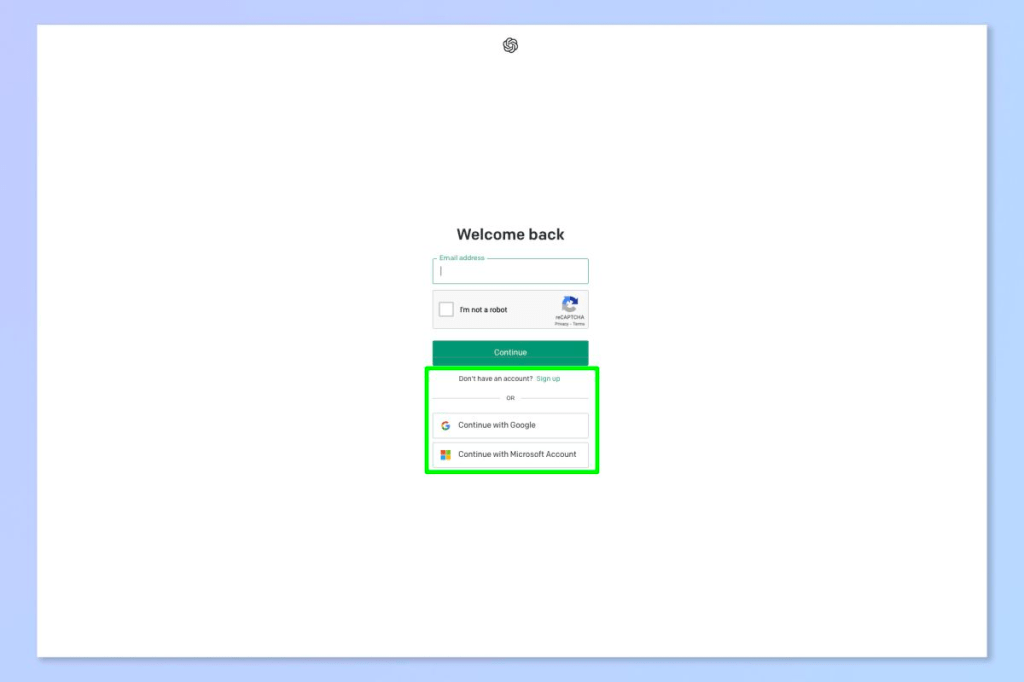 2. Select Sign up again and follow the steps to create an account manually, or select Continue with Google/Microsoft to log in using one of those accounts. Here, we’re using a Google account.